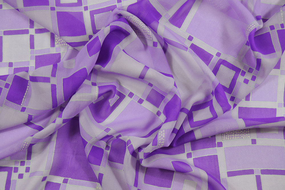 Crêpe georgette di pura seta, leggerissima e vaporosa, trasparente. Fantasia geometrica a quadri in lilla e viola, con piccoli dettagli glitterati argento . Tessuto di mano crespa, dal tipico tocco ruvido, molto fluido, vaporoso e trasparente.