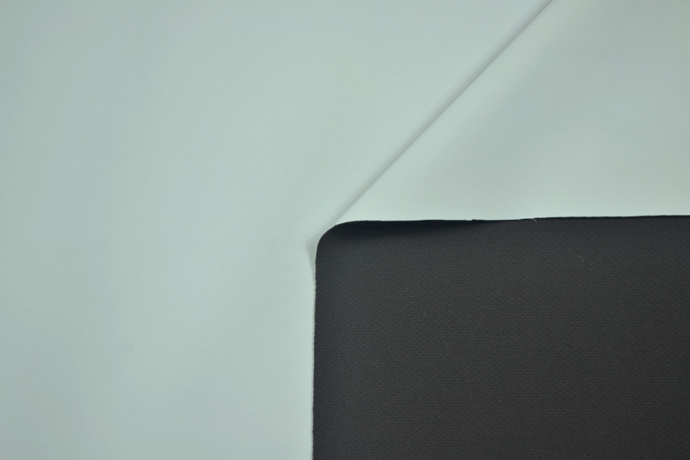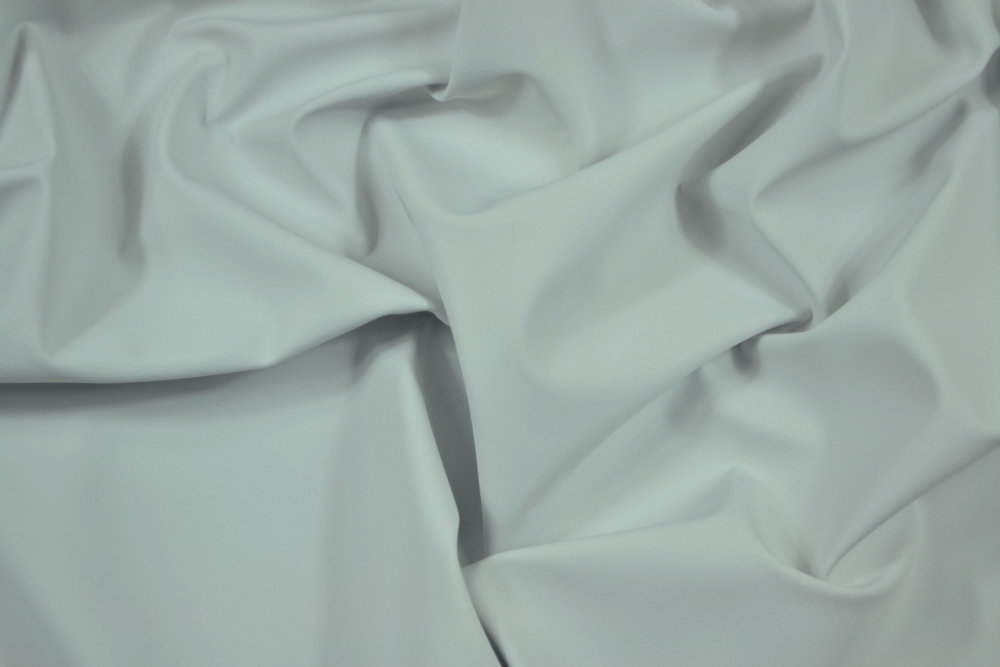 Tessuto sintetico idrorepellente bianco latte con membrana in PVC sul rovescio. Robusto e morbido (anche se è piuttosto pesante ) e leggermente elasticizzato.