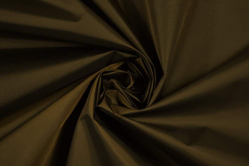 Tessuto sintetico idrorepellente di medio peso marrone. Sottile ma robusto. Si tratta di un tessuto idrorepellente: l'acqua scivola sulla superficie senza bagnare il tessuto e comincia a penetrare solo dopo un contatto prolungato. NON è totalmente impermeabile. Aspetto semi-lucido.