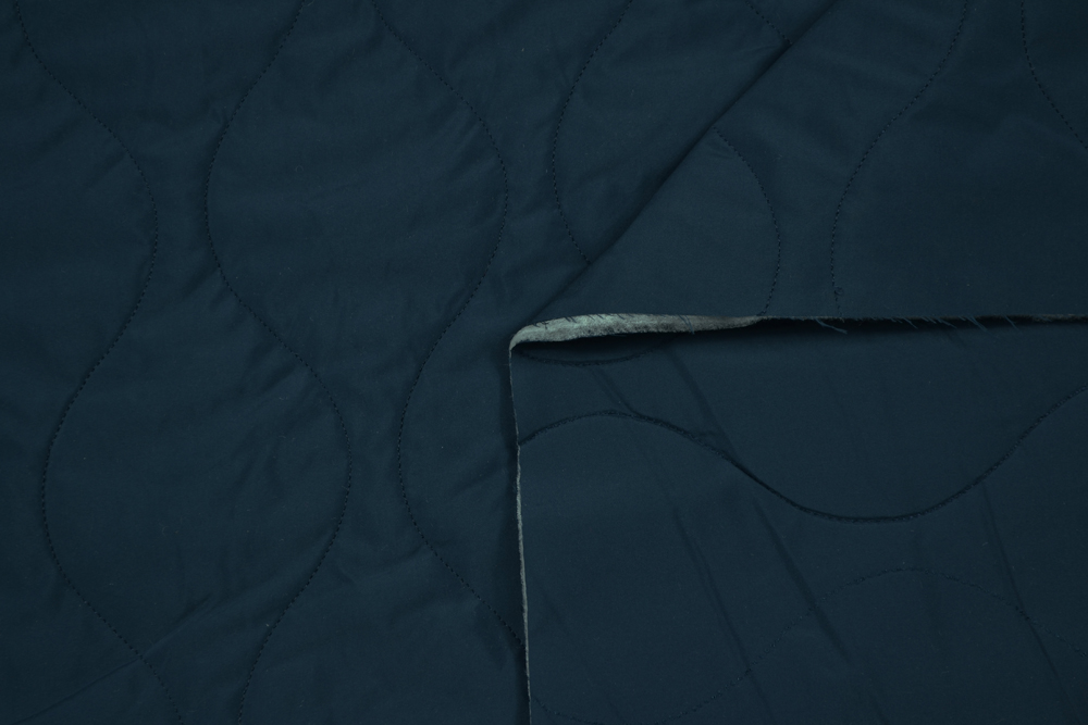 Tessuto idrorepellente blu opaco trapuntato double face con imbottitura in ovatta di poliestere. Prodotto di ottima qualità !