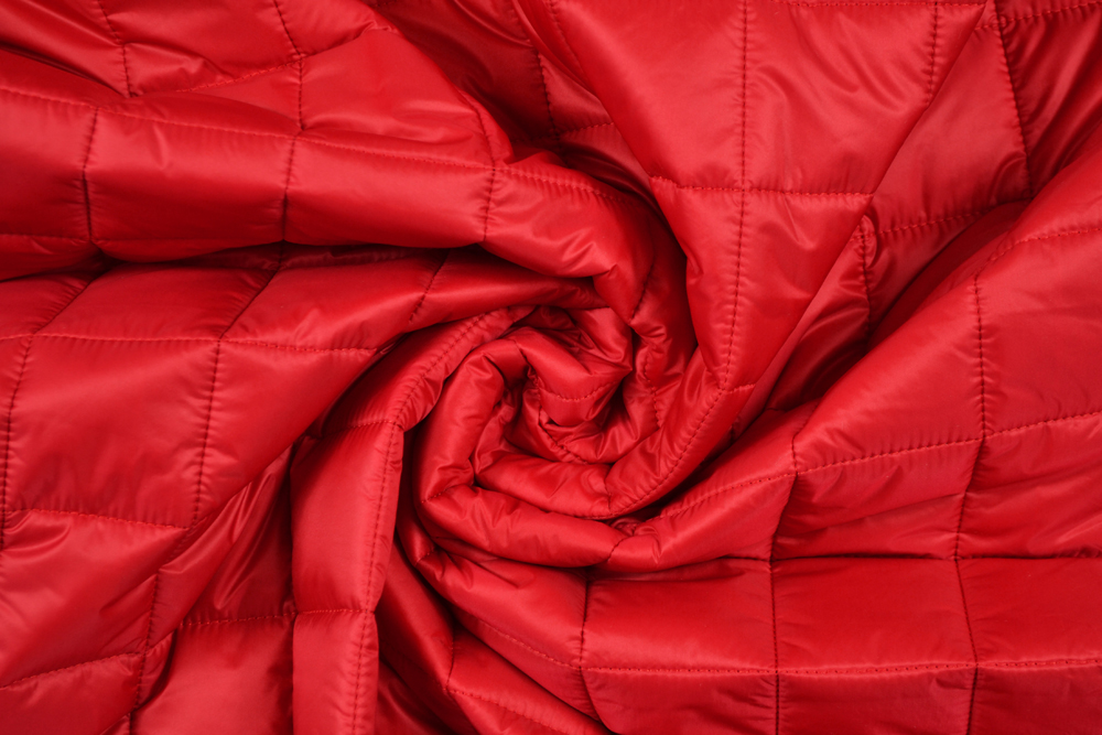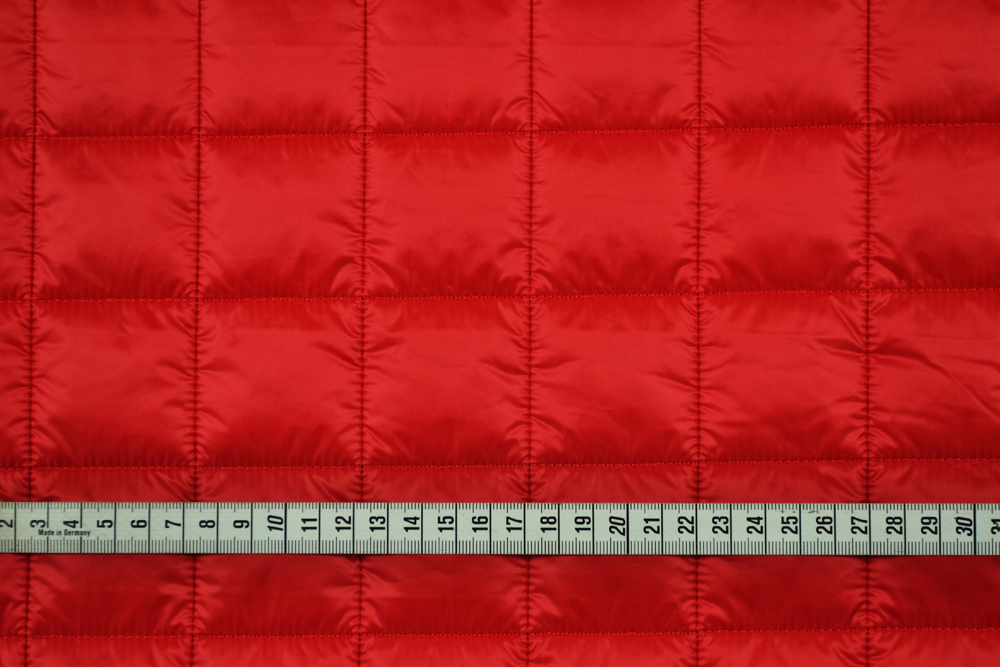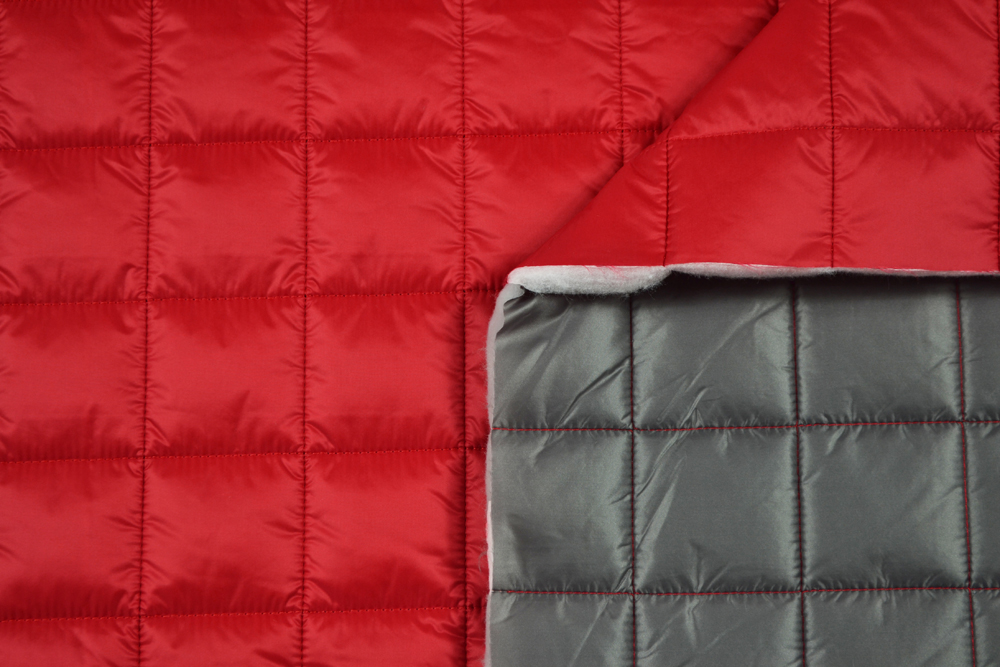 Tessuto idrorepellente trapuntato double face con imbottitura in ovatta di poliestere. Colore rosso da un lato, e grigio dall'altro lato con trapuntatura a quadri di circa 5x5 cm. Prodotto di ottima qualità !