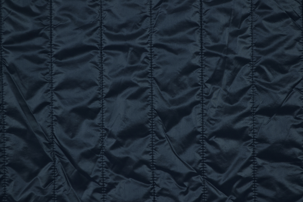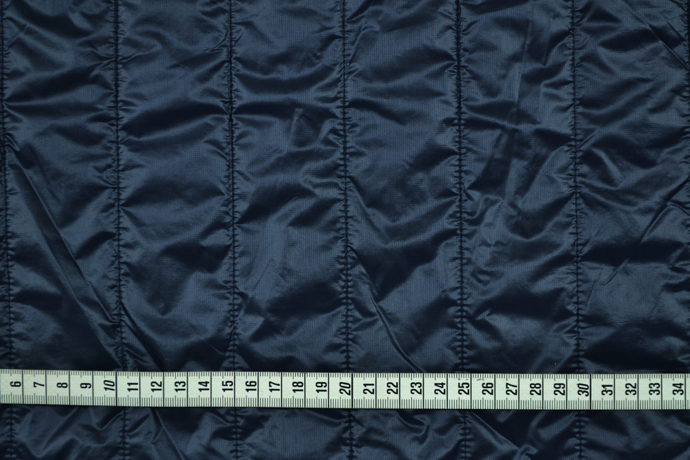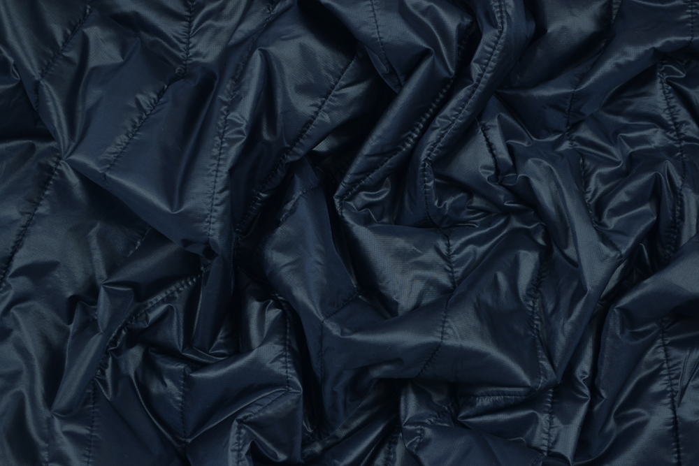 Tessuto idrorepellente trapuntato double face con imbottitura in ovatta di poliestere. Tessuto tecnico ripstop idrorepellente blu da un lato, e tessuto idrorepellente blu dall'altro lato con trapuntatura a righe di 5 cm. Prodotto di ottima qualità !